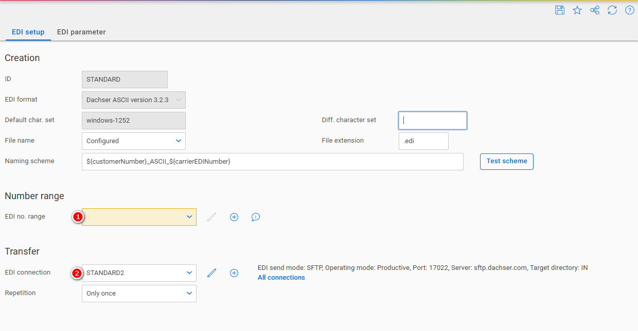 | 2 | EDI connection | The SFTP-Parameters used for the EDI upload. See EDI connection |