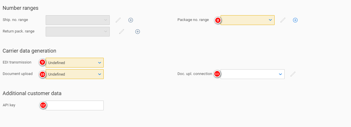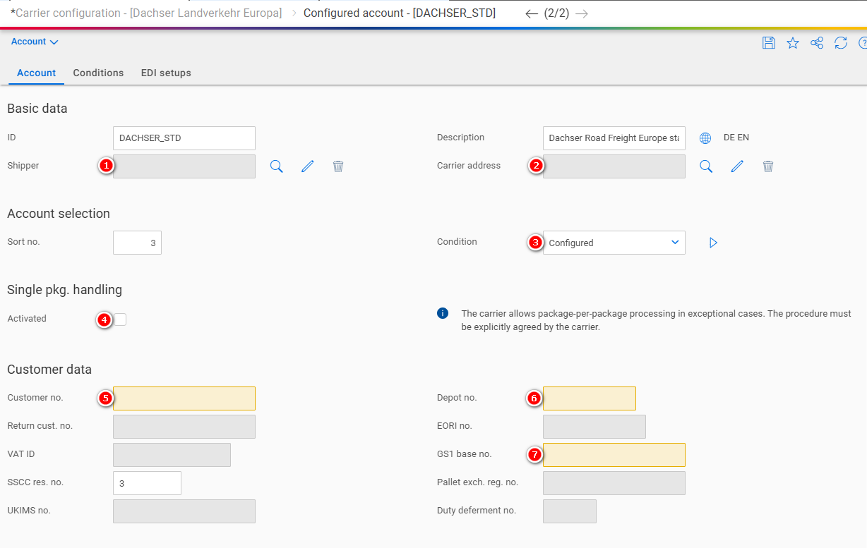 | 1 | Operating mode | You can configure both test and productive parameters. This depends on your carriers setup (does he offer a test EDI-upload?) |