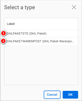 - (2) DHLPAKETWARENPOST (DHL Paket Warenpost) only if you will use the value-added service DHL small parcel (DHL_STD_WPNATIONAL).