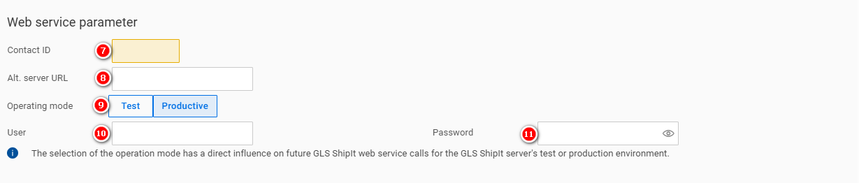 | 8 | Alt. server URL | Assigned by the carrier. The URL used for the GLS webservice. It looks like this: https://shipit-wbm-de01.gls-group.eu:8443/backend/ShipmentProcessingService/ShipmentProcessingPortType |