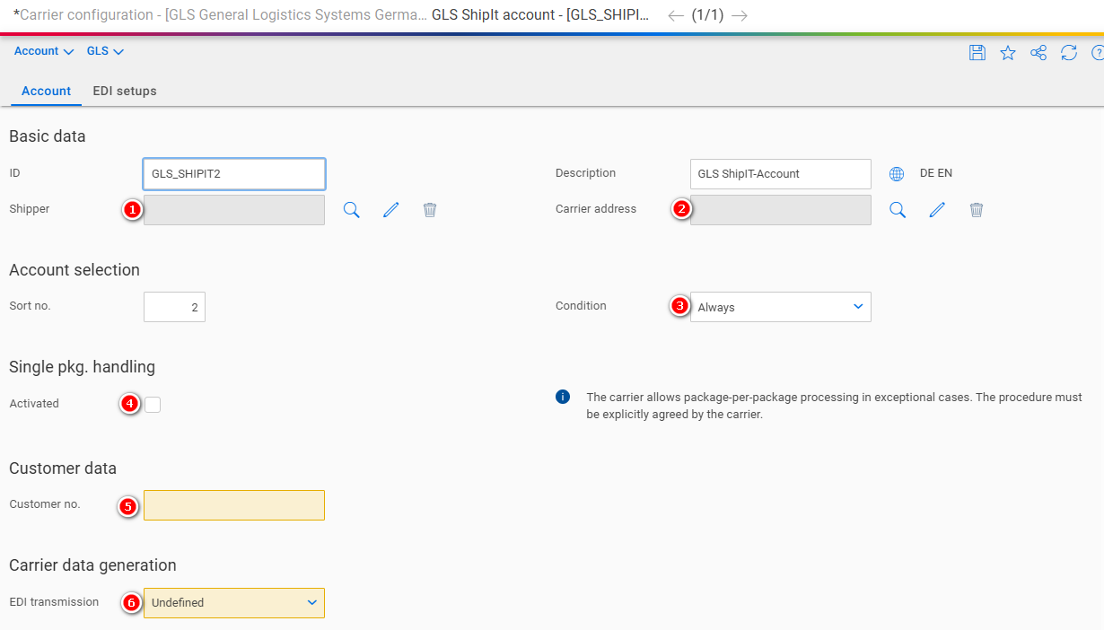 To create a new GLS account in Carrier Connect, open GLS in Master data > Carrier configurations. In the tab Accounts click on New.